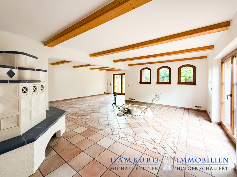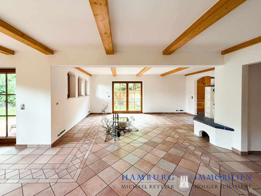Im Erdgeschoss ist Ihr ca. 44 m² grosses Wohnzimmer mit einem edlen Kachel-/Kaminofen und einem mediterranen Fliesenboden mit Fussbodenheizung. Durch mehrere bodentiefe Terrassentüren gehen Sie auf Ihre Süd/Westterrasse und in den Garten.