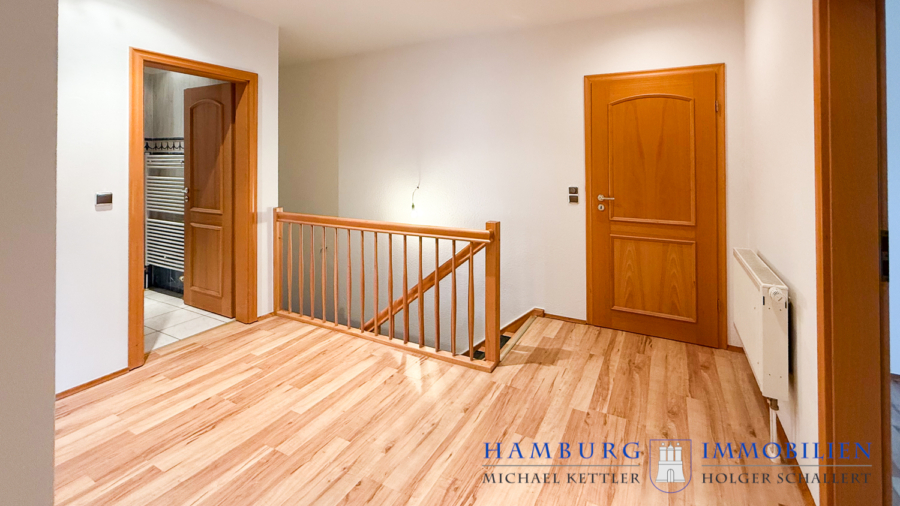 In Ihrem Obergeschoss mit einem nicht zu kleinen Flur sind ein Vollbad und drei vernünftig grosse Schlafzimmer mit Laminatboden.
