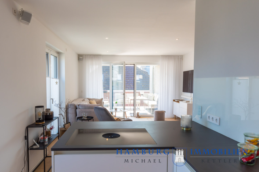 Das Herzstück ist der offene Wohn- und Essbereich mit integrierter, hochwertiger Einbauküche (ca. 30.000 €). Bodentiefe Fenster schaffen eine helle und freundliche Atmosphäre und ermöglichen den direkten Zugang zum Balkon. Zwei komfortable Schlafzimmer, ein modernes Duschbad sowie ein praktischer Abstellraum runden das Raumangebot ab.