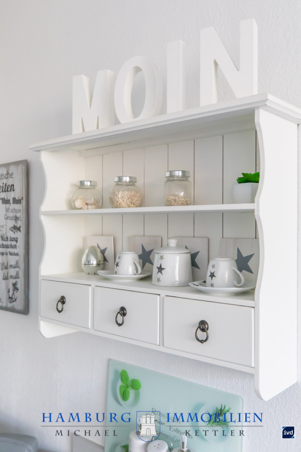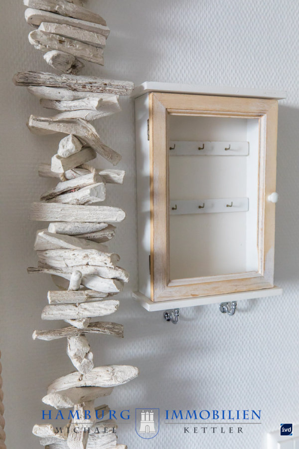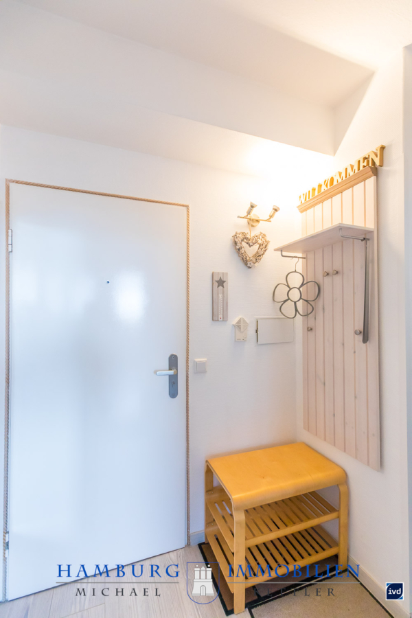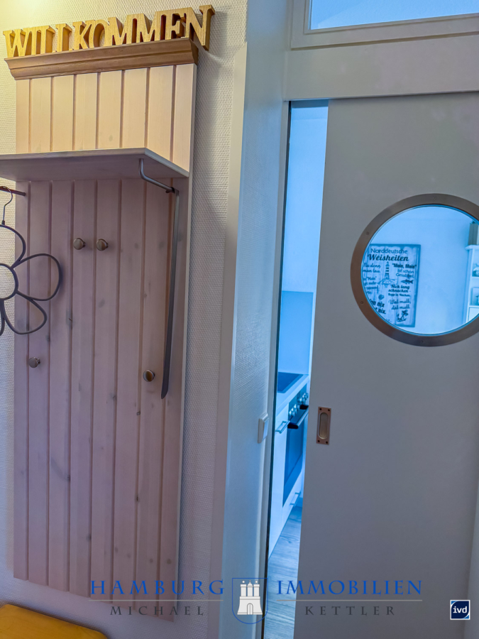 Bereits beim Betreten der Wohnung empfängt Sie ein gepflegter Flur mit modernem Vinylboden, Holzgarderobe mit maritimer Tau-Umrahmung sowie großzügigen Stauraumlösungen. Von hier aus sind alle Räume bequem erreichbar.