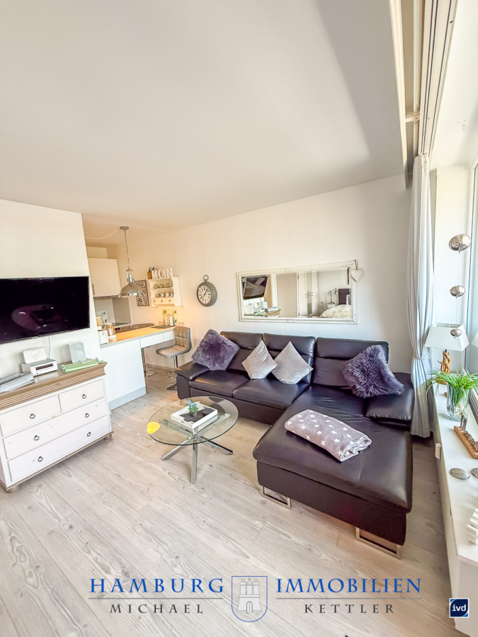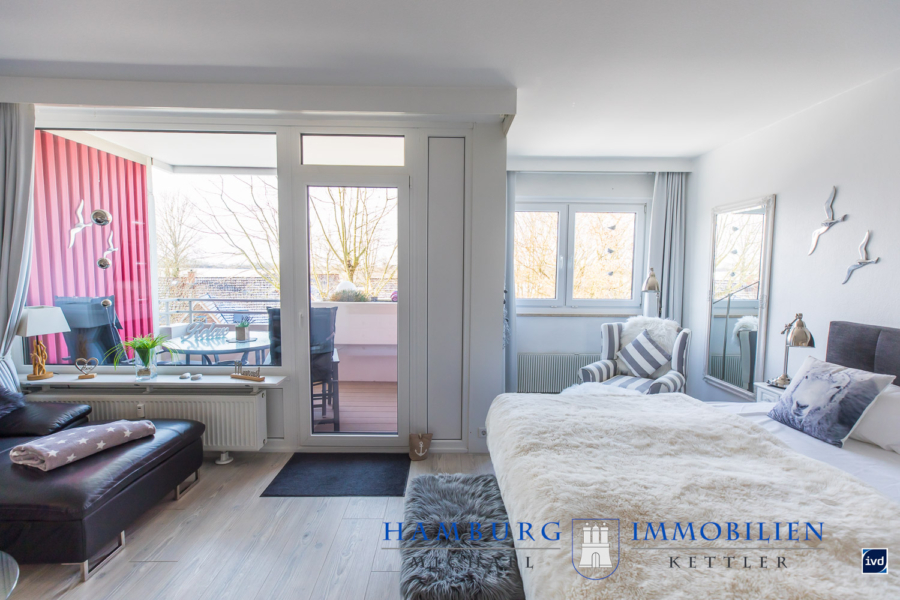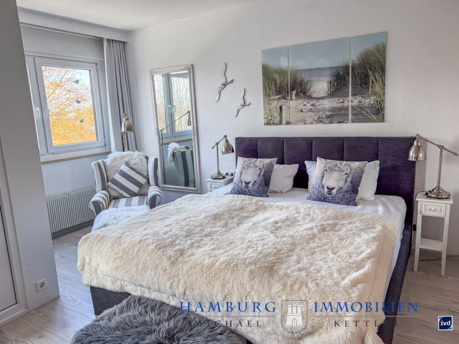 Der kombinierte Wohn- und Schlafbereich präsentiert sich geschmackvoll möbliert und harmonisch abgestimmt. Leder und Holzelemente in Verbindung mit Chrom-Details schaffen ein elegantes, zugleich gemütliches Ambiente. Ein komfortables Boxspringbett, ein großzügiger Kleiderschrank mit weiß lasierter Oberfläche und Schilffarbenden-Zierleisten sowie stilvolle Beleuchtungselemente unterstreichen den hochwertigen Charakter der Wohnung.