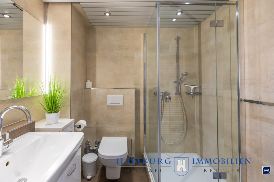 - Sandfarbene Wandfliesen bis zur Decke
